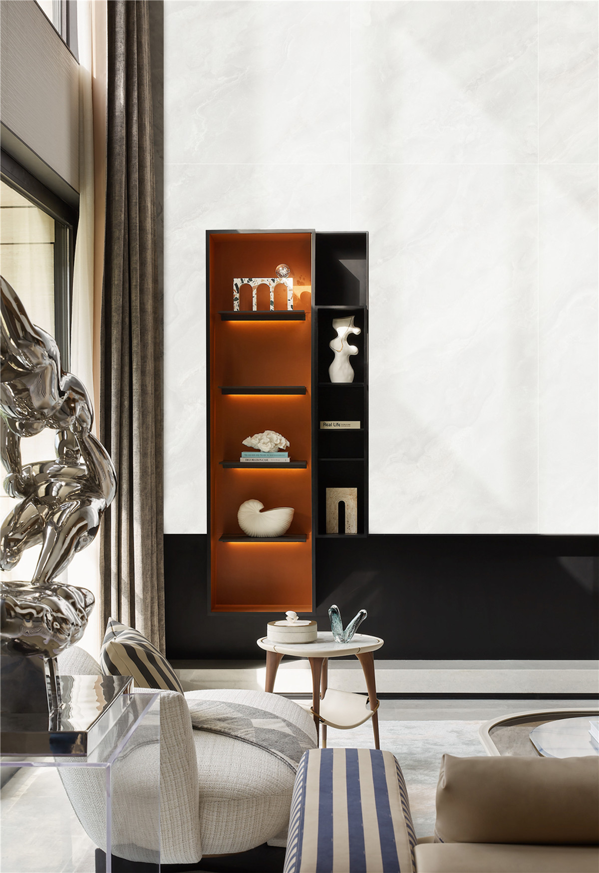 以玉石作為貫穿空間的主題元素,通過材質的重構、色彩的沁潤、光影的流動、虛實穿插藝術的點綴融入其中。